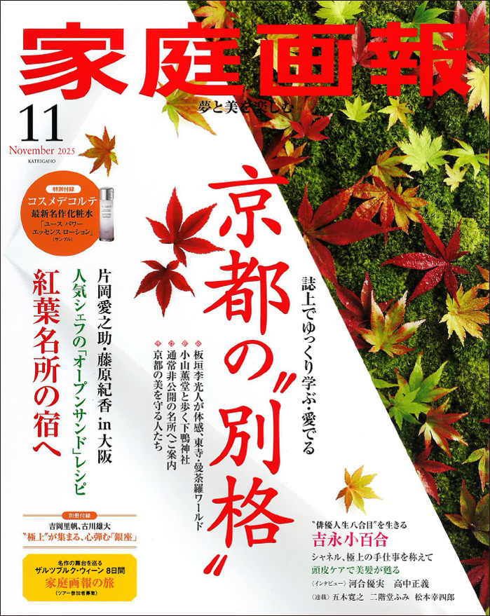 「家庭画報」2025年11月号にて HOPの作品が紹介されました! 2025年10月3日 “夢と美を楽しむ”というコンセプト、”美しき伝承”というテーマを掲げ、次世代にも受け継いでいくべき伝統・文化を伝える。全国誌「家庭画報」11月号(10月1日発売)にて、HOPの作品が紹介されました! 全国の書店にて発売中です。どうぞご覧くださいませ! <<写真をクリックすると拡大します>> クリックすると拡大します