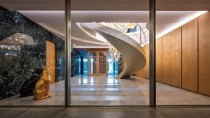 日本古来の風水を大切にするオーナーの要望を満たしつつ、いかにモダンなデザインへと昇華させるかが、設計のテーマとなった。鬼門・裏鬼門に水回りを配置しない、四角い外構平面、東向きの大開口を設けるといった条件に沿いながらプランを検討。1階は広々としたエントランス空間と5台が駐車可能なガレージ空間のみとし、2階をメインの生活の場とした平家のような感覚の終の住処となった。風水では色彩も意味を持ち、なかでもオーナーが好むゴールドは富や繁栄の象徴として重要な色となっている。そこで、エントランスの自動ドアが開くと出迎えてくれる煌びやかなシャンデリアはゴールド、優美な曲線を描く螺旋階段の鉄骨部分はシャンパンゴールドのメタリック塗装で仕上げた。リビングでは、ソファ背面の壁には金雲母の左官材を用い、プライベートジムの壁にもアクセントとしてゴールドのタイルを使用するなど、空間のなかにゴールドが溶け込むよう、各所で工夫を凝らした。オーナーが好まれる蛇紋石も、そうした空間で効果的に使用。目を引くエントランスの両側や、リビング開口部の両サイドに挿入することで、邸宅全体で考慮された風水の要素を現代風に、かつスタイリッシュにまとめる役割を持たせている。オーナーのパーソナリティが住まいとしての特徴を醸し出す、まさに唯一無二の邸宅となった。