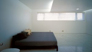 設計にたっぷり1年以上を費やしたというこの家は、1階にお母様、2階に息子であるオーナーご夫婦が暮らす2世帯住宅である。お母様が暮らす1階は、エントランスの上品な格子戸からも想像できるように、本格的な和室を備えた木のぬくもりあふれる住まい。そして、オーナーご夫婦が専有する2階は雰囲気が一転、白い大理石と漆喰で仕上げたエレガントな空間である。最初から鉄筋コンクリート造で建てると決め、構造の特性を生かした広さや強さを住空間のなかに表現したのだ。100㎡を超えるフロアにリビング・ダイニング・キッチン、ベッドスペースを計画的に配置して、大胆なワンルームスタイルで使用。最高で4mある天井の高さも伸びやかな気分を誘い、ハイサイドライトから入る自然光が描くコントラストも、空間を立体的に見せ、さらに美しいものにしている。